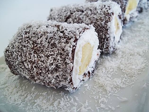 Tepsinë e vendosim në frigorifer për 4 orë. Pasi të kenë kaluar 4 orë e marrim tepsinë nga frigoriferi dhe me anë të thikës e presim ëmbëlsirën në drejtkëndësha të vegjël. Tek çdo drejtkëndësh vendosim një pjesë banane dhe me kujdes e mbledhim me ëmbëlsirë në formë ruloje. Kështu veprojmë me të gjitha pjesët e tjera. Tashmë ëmbëlsira është gati për t’u servirur.